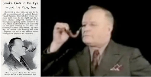 Alfred Langevin (Around 1885 - February 1974), AKA the "Eye Smoker," could smoke a pipe, play a recorder, smoke a cigarette, and even blow up a balloon through his eye. He would put a pipe in his eye and smoke would come out of the pipe, and out his mouth. He was married to his wife on June 26, 1909. He was from Canada.